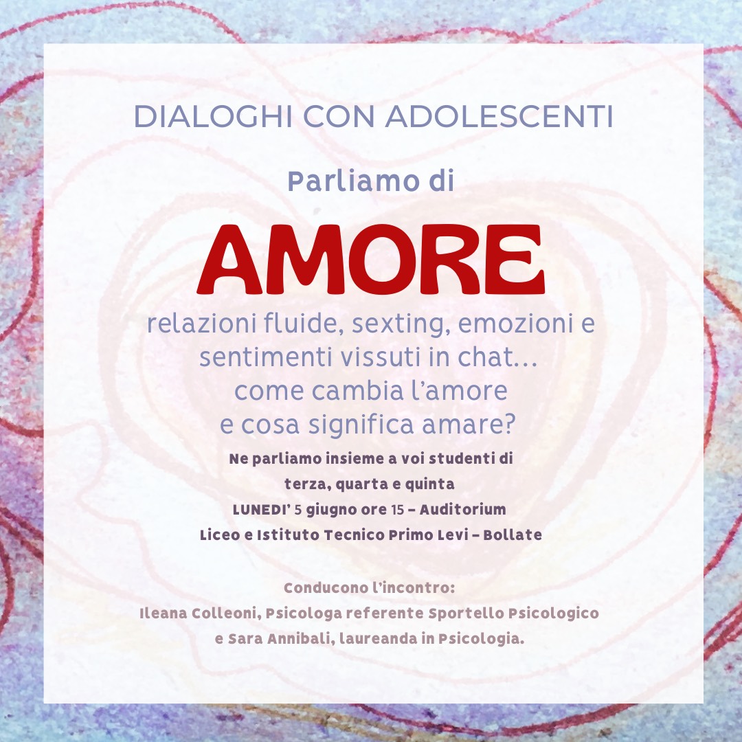 Si comunica che nell'ambito del progetto "Dialoghi con Adolescenti", la dott.ssa Ileana Colleoni, psicologa referente del nostro sportello di ascolto, propone questa interessante iniziativa rivolta agli studenti del triennio con tema "Amore"
