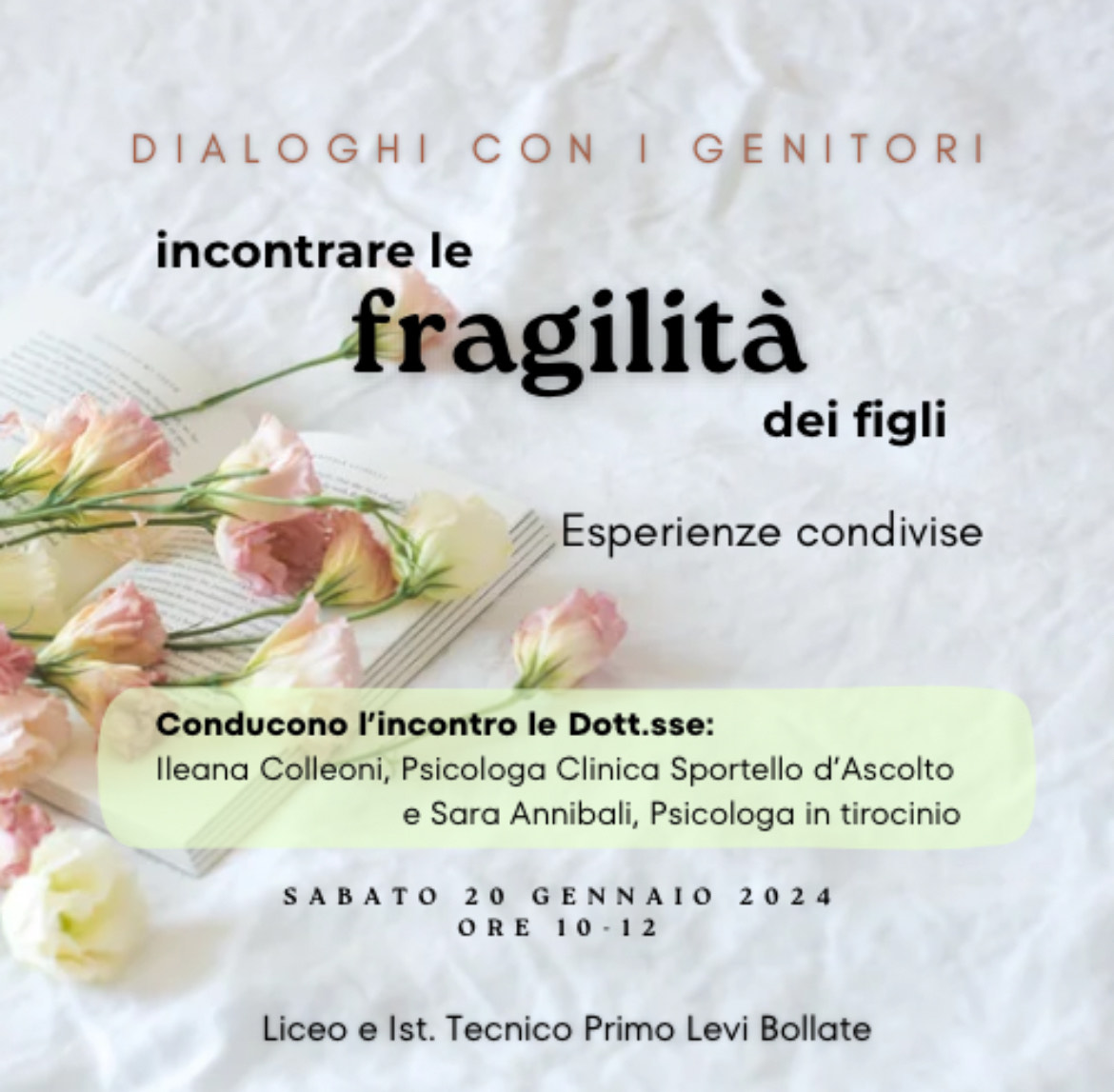 La dottoressa Colleoni, referente dello sportello di ascolto del nostro Istituto, è lieta di invitare i genitori a un secondo incontro di dialogo di esperienze condivise per approfondire il tema delle fragilità, da molti richiesto.